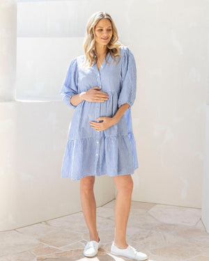 The Freya Maternity Tiered Linen blend Maternity Shirt Dress is a versatile and flattering dress that you can wear all throughout your pregnancy. Also perfect for postpartum as it is nursing friendly and a flowing silhouette.