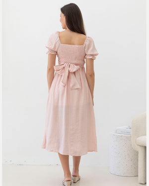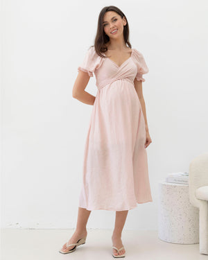 Designed with loose short sleeves featuring delicate ruffle elastic edges and a smocked stretch back for extra comfort as your bump grows. The adjustable front tie can be styled in multiple ways to create different looks — making it a perfect piece from pregnancy through postpartum.